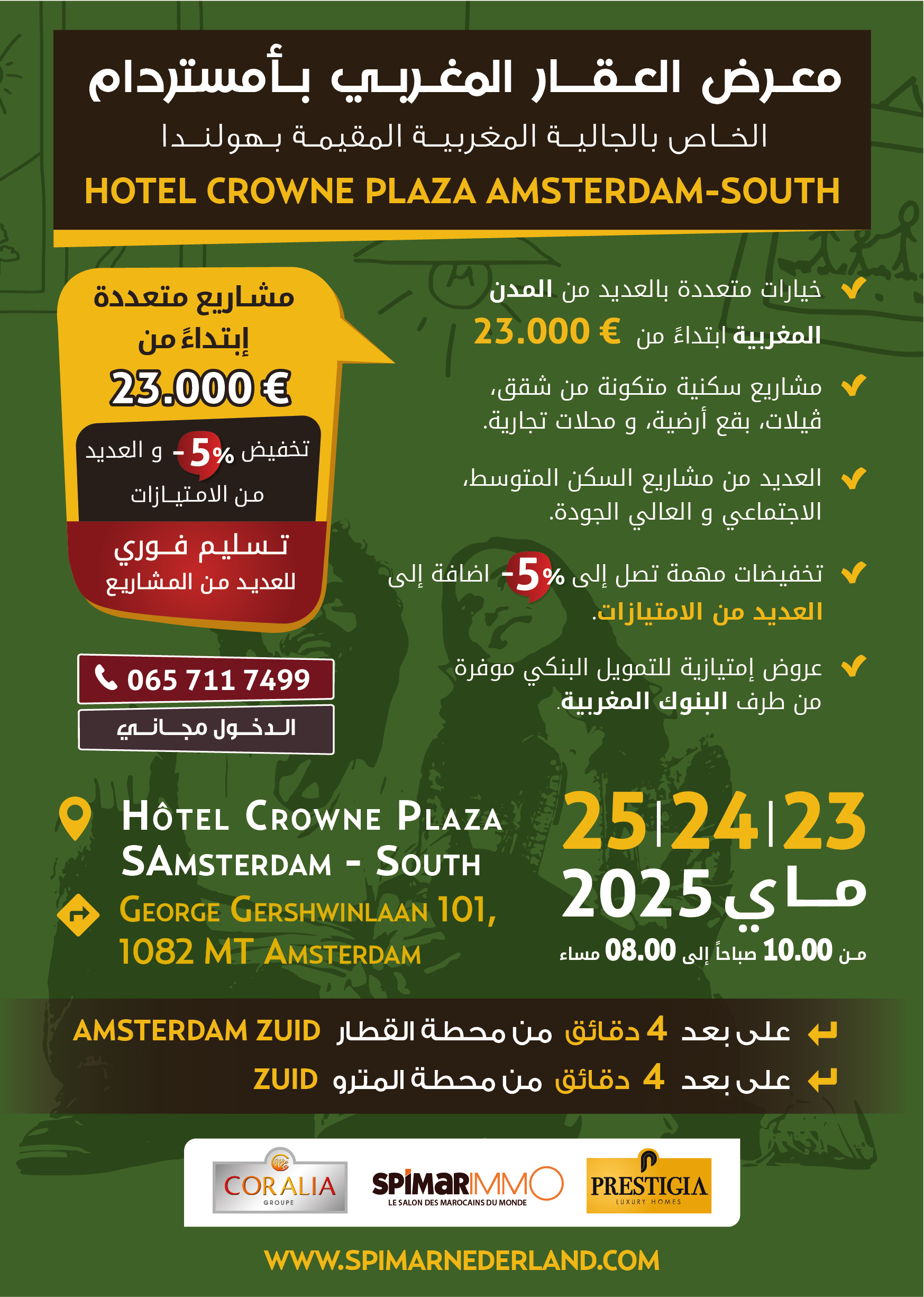 تدعوكم مجموعة كوراليا إيموبيليي و مجموعة بريستيجيـا لحضور فعاليات النسخة السادسة لمعرض العقـار المغربي بأمستردام الخاص بالجالية المغربية المقيمة بهولندا و ذالك أيام الجمعة 23، السبت 24 و الأحد 25 مــاي 2025، من الساعة 11:00 صباحا إلى 20:00 مساء بالعنوان التالي: